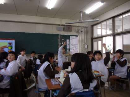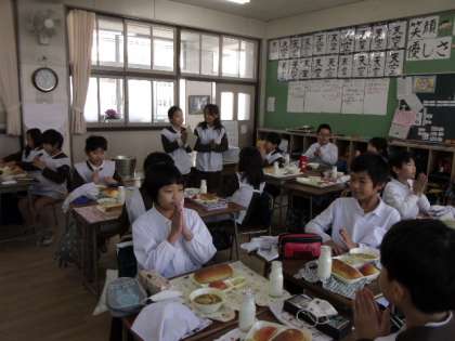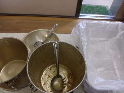 今日はみんなの大好きなカレーうどんです。少し残ったカレーうどんを、おかわりしようと、たくさんの人がじゃんけんに参加しました。パンもおかずもりんごも牛乳もみんな空っぽになりました。