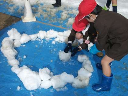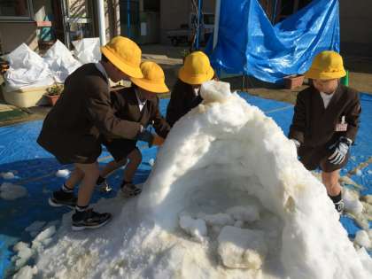 この行事は毎年堀江幼稚園で人工雪を降らせ、園児が遊んだあとに1年生も遊ばせてもらっているものです。