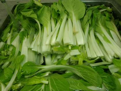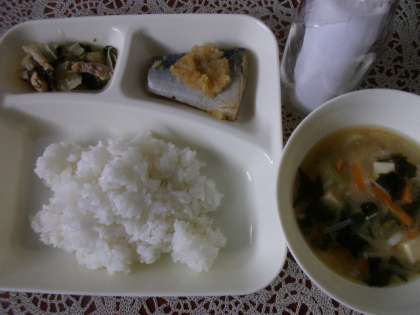 今日の献立は「ごはん、さばのみぞれかけ、みそ汁、おおさかしろなの煮びたし、牛乳」でした。さばは塩焼きにして、だいこんおろしにゆずの風味をきかせたたれをかけました。さばのくさみが消えて食べやすくなりました。なにわの伝統野菜の一つ「おおさかしろな」は、鶏肉といっしょに煮びたしにしました。