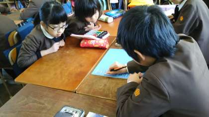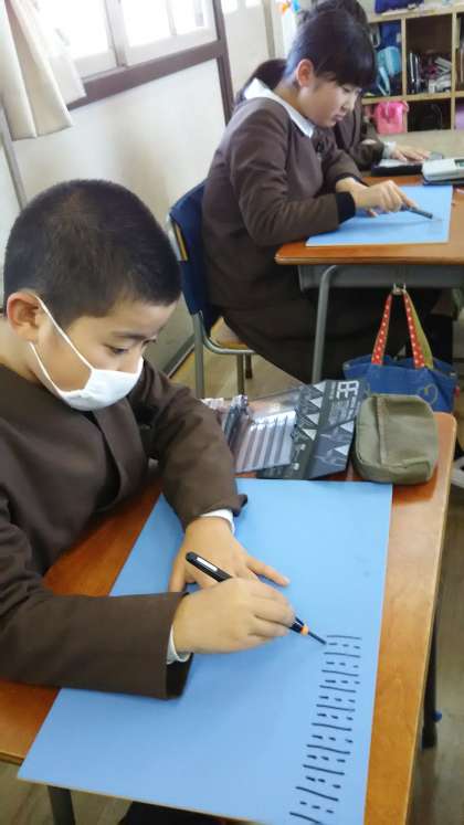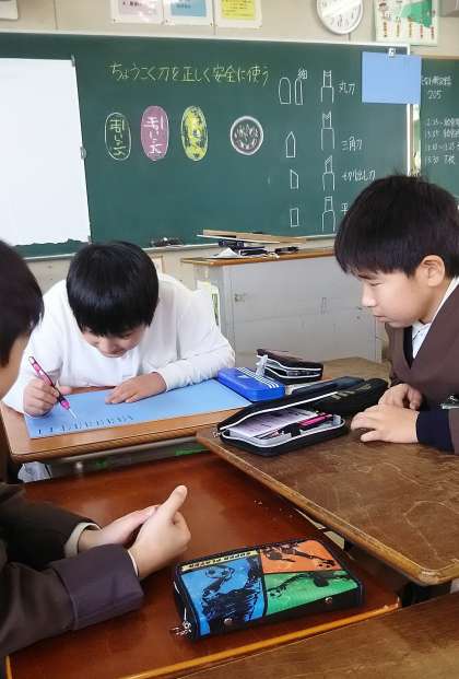 3学期に取り組む木版画に向けて学習しました。はんこの文字はどうなってる?と考え、残したいところは彫ってはいけないことに気づきました。彫刻刀の刃の形を1本1本確かめた後、実際に試し彫りをしてみました。安全第一です。わくわくする気持ちをぐっとこらえて、皆、慎重に彫ることができました。どんな作品ができるでしょうか。楽しみです。