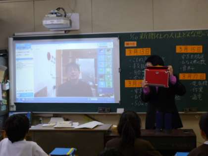 5年の社会で、インターネット通信のTV電話(skype)を利用して、東日本大震災で大きな被害を受けた状況を「石巻日日新聞」の壁新聞で発信してきた記者の方に、自分たちが調べて疑問に思ったことを質問しました。