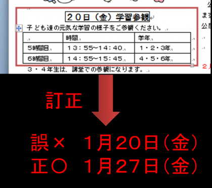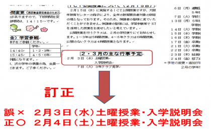 本日、配付しました学校便りですが、1月の学習参観と2月の行事の一部を訂正します。