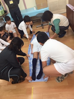 1枚目:毛布やシーツを使って、けが人や病人を運ぶ方法です。