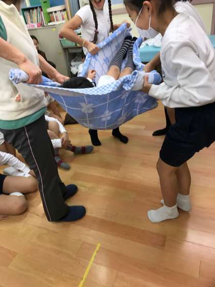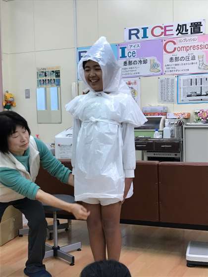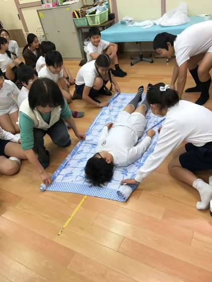 五年生最後の二測定をおこないました。はじめに保健室の養護教諭から災害が起こったときのけがの手当ての仕方を教えていただきました。新聞紙を使ってコップや靴、ビニール袋で防寒具を作ったり、布で担架を作ったりと、その場にあるものを活用した手当の仕方を学びました。