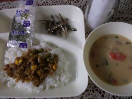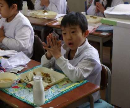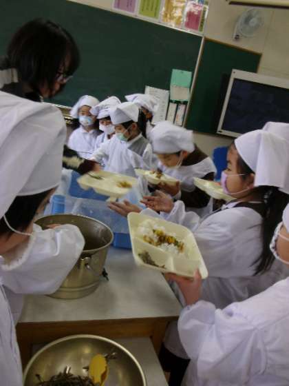 1年生の教室では、配膳された給食を見て、この魚はなんだ?みそ汁の中の赤い色のものはなんだ?と???がたくさん飛んでいます。びっくりしながらも、食べてみるとおいしいので、おかわりの人がたくさんいました。
