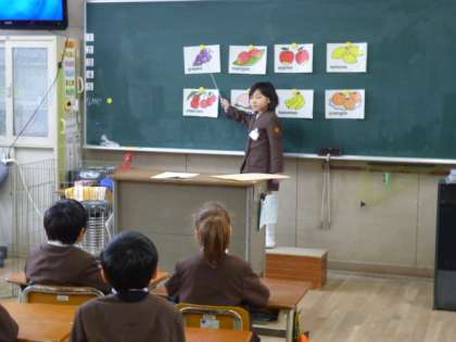 1・2年生は、果物の名前を英語では・・・? 前に立って発音してくれる子もいます。