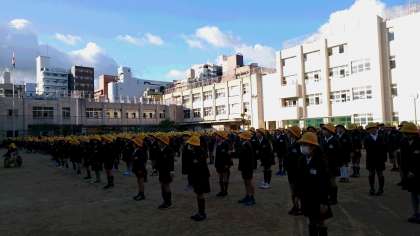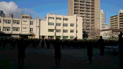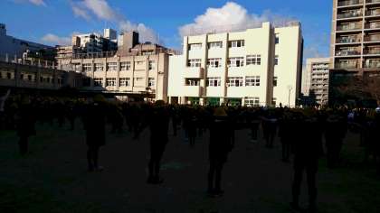 寒い朝会ですが、まずはラジオ体操から始めます。