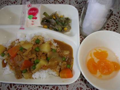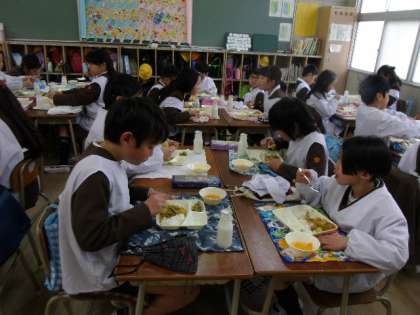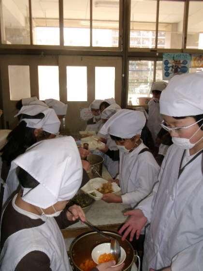 1月23日〜27日は、堀江小学校の学校給食週間です。今日はちょっと早いですが、献立がカレーライスだったので、交流給食をしました。2−1と5−1では、半分の児童が入れ替わり一緒に給食を食べました。2年生の教室では、2年生が給食当番をして5年生がうけとっています。いつもとは違うメンバーでの給食でしたが、すぐに話に花が咲いていました。