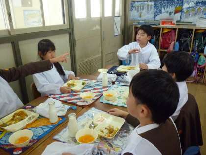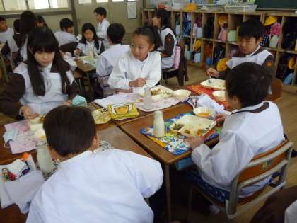 給食週間を前に交流給食をしました。5年生と仲良くおしゃべりしながら楽しく食べました。5年生がいっぱいおかわりをして、あっという間に完食。楽しい時間でした。