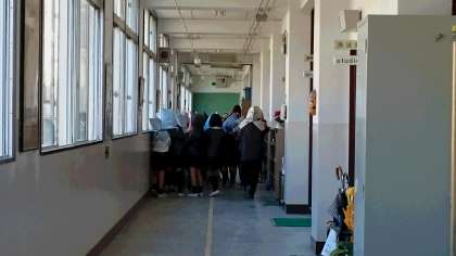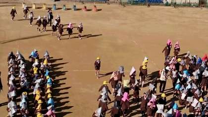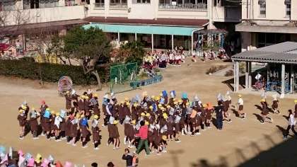 堀江幼稚園と堀江小学校の合同で避難訓練を行いました。