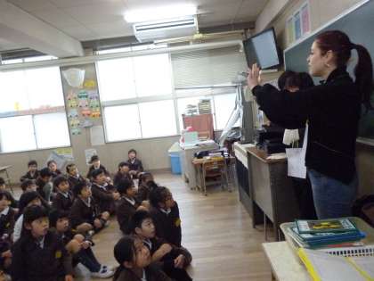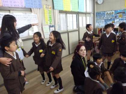 2年生の2クラスにそれぞれ2人の留学生が来てくれました。いっしょに英語であいさつしたり、歌やゲームを楽しみました。留学生の国の様子も教えてもらいました。