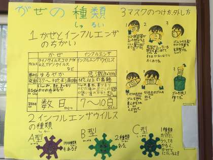数人で1枚の掲示物を作成し、完成後は保健室前に掲示しています。