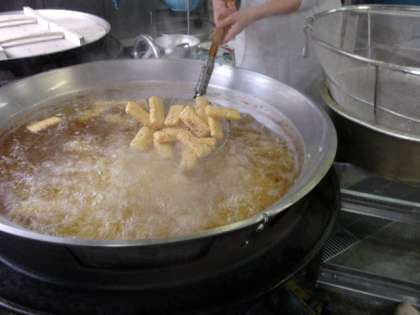 今日の献立は「パンプキンパン、いかてんぷら、スープ煮、あっさりきゅうり、牛乳」でした。パンプキンは、かぼちゃのペーストが入っているのでほんのりオレンジがかった色をしています。パン屋さんが、朝焼いて届けてくれるので、ふかふかで柔らかく大人気です。いかてんぷらは、大きな1枚ものです。大きな釜にたっぷり油を入れてあげたので、衣がサクサクでした。