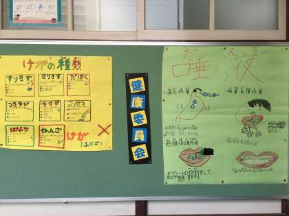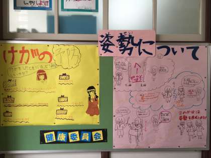 数人で1枚の掲示物を作成し、完成後は保健室前に掲示しています。