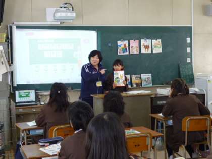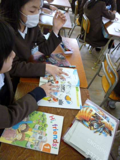 5年生の今日の授業は、「What is it?」「Do you like 〜?」で、イラストを指でさして発音します。