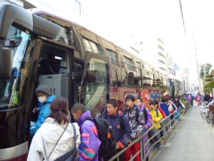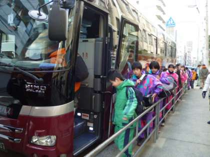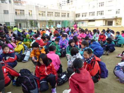 朝7時40分に学校に集合。カラフルなスキーウェア—を着て、校庭が華やかになりました。