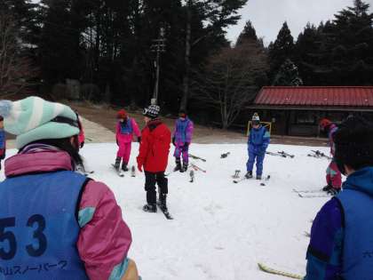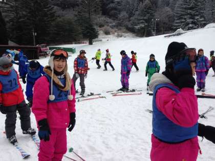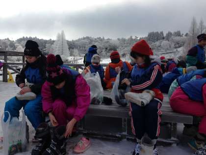 はじめての子は、ブーツとスキーをやっとこさ装着して、こわごわ雪の上に。
