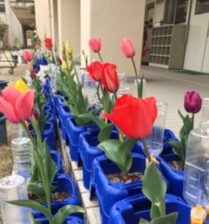 学校のチューリップも太陽の方を向いて咲き始めています。