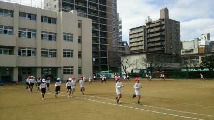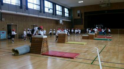 1、2組の今週の体育は講堂で跳び箱をして、運動場ではマラソン、なわとびやボール蹴りをしました。