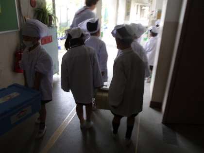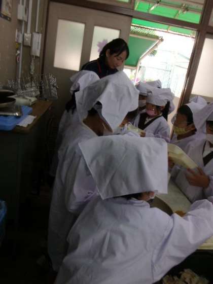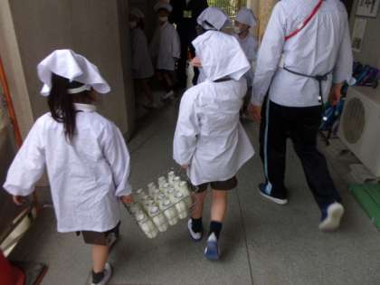 1年生もしっかり給食が運べるようになりました。教室まで給食を運んだら、次は配膳です。汁物などは先生が入れますが、ごはんや小さいおかずは自分たちで入れています。