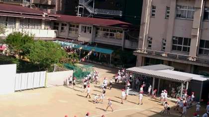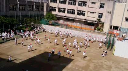 応援団が朝練習を行っている横で、他の児童は朝遊びをしていました。