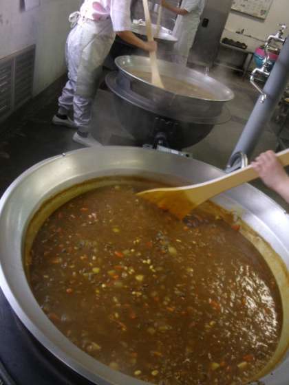 今日の献立は「牛肉と大豆のカレーライス、レタスのサラダ、ヨーグルト、牛乳」でした。大豆の入ったカレーライスでしたが、北海道産のプリプリの大豆は甘くてやわらかくて食べやすいので、1年生にも大好評でした。1080人分のカレーは大きな釜を3つ使って作りました。きれいな緑色のレタスは蒸して、りんご酢を使った手作りドレッシングをかけました。