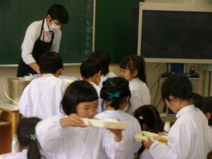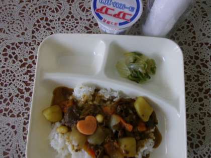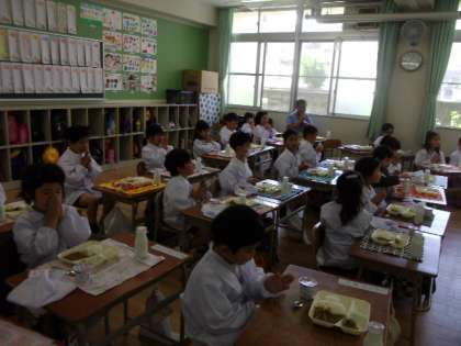 1年生も、今日から他の学年と同じ給食時間で準備を始めます。今日はカレーだったので、準備も食べるのもスムーズでした。カレーのおかわりにたくさんの人が並びました。カレーもサラダもお休みの人の牛乳も、全部空っぽになりました。