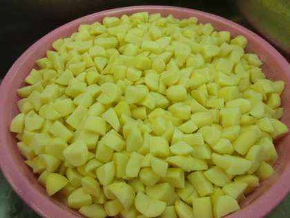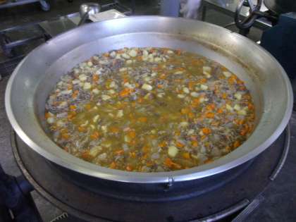 今日の献立は「ごはん、肉じゃが、もやしのゆずの香あえ、枝豆、牛乳」でした。堀江小学校の肉じゃがには、じゃがいもは53kgも使います。そして、肉じゃがは大きな釜を2つ使って作りました。しっかり味を煮含めるので、とてもおいしく仕上がります。枝豆は、冷凍のものを釜で色よくゆでました。