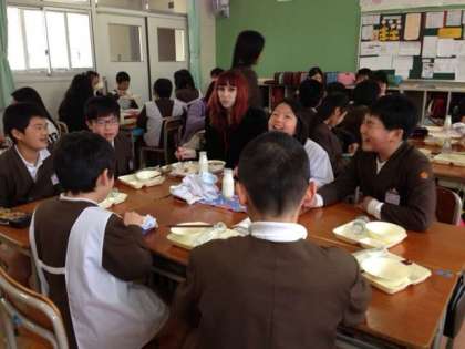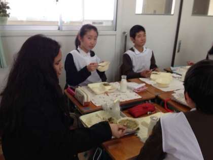 留学生の方と一緒に給食を食べました。