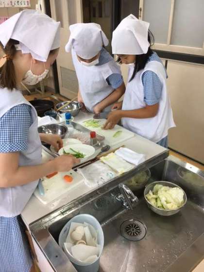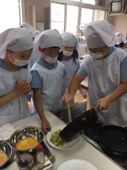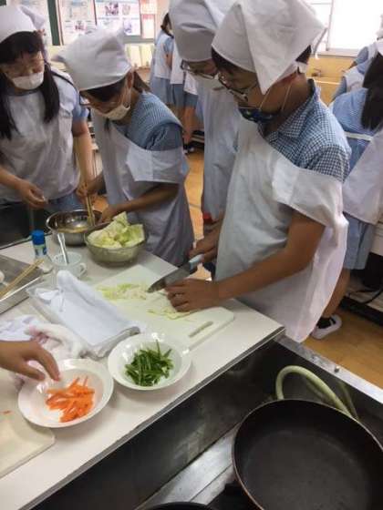 ベーコンと三色野菜の炒めものとスクランブルエッグを作りました。準備から片付けまで協力して実習することができました。