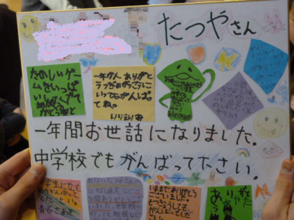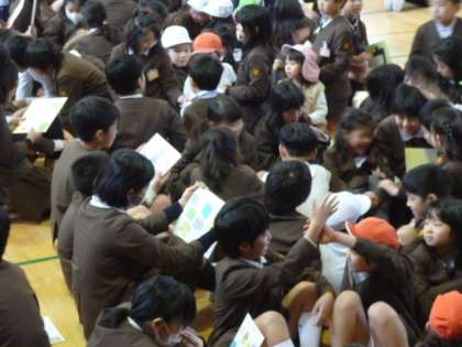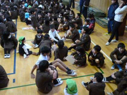 一年間のなかよし班活動で、6年生に感謝する「ありがとう集会」を開催しました。班ごとに円座になってジェスチャーゲームを楽しんだ後、6年生に感謝を込めて寄せ書きをプレゼントとしました。