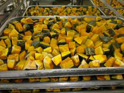 今日の献立は「ごはん、すき焼き煮、三度豆のごま酢あえ、焼きかぼちゃの甘みつかけ、牛乳」でした。すき焼き煮は、国産の牛肉をたっぷり使って作ります。あつあげやふにも味が浸み込んで、ごはんがすすみました。今が旬の三度豆は、ゆでて甘酸っぱい味のたれをかけ、いりごまをふりました。かぼちゃは、一口大に切ってこんがりと焼き、甘いみつをかけました。