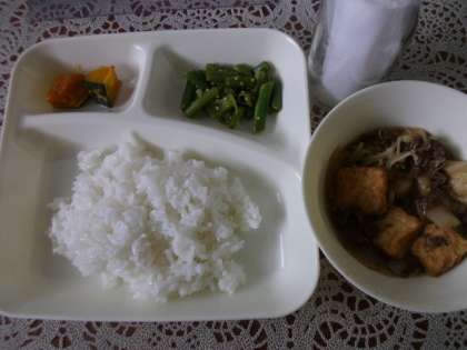 『三度豆やかぼちゃの献立は残るかな〜』と思っていましたが、野菜が大好きな子もいて、空になりました。すき焼き煮は、「後おかわり3人分です。」と云うと、あっという間に空になりました。