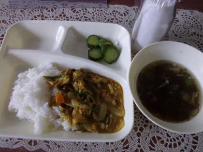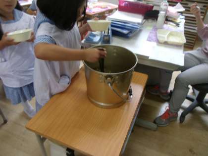 1年生は、とろり汁の中に黒いもずくが入っていてびっくりでした。減らす人が多い中、「もずくスープって食べたことあるけど、おいしかったよ!!」という子もいます。結局、食べてみるとおいしくて、空っぽになっていました。