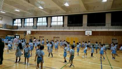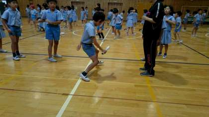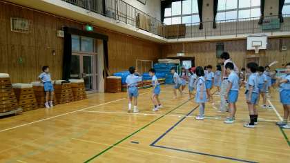 反復横跳びの力をつけるために、朝遊びで「横跳びリレー」を行っています。