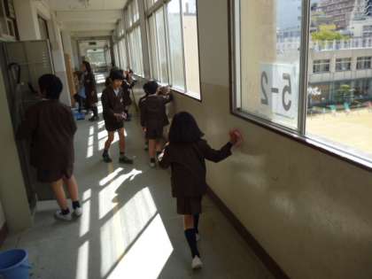 今学年最後のクリーン大作戦を行ないました。このクリーン大作戦は、1年生から6年生の縦割り班で、各学期の終わりに普段できないところの掃除を隅々までします。下級生が届かないところは、上級生が手を貸してあげます。