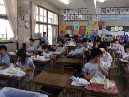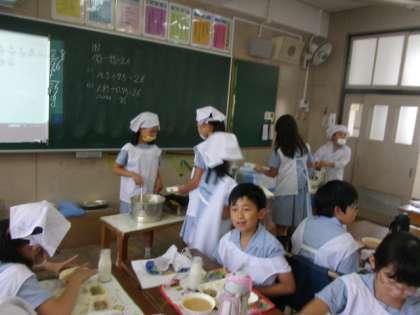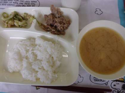 5年生の教室では、配膳が終わって「いただきます。」をすると、もっと増やしてほしい人がたくさんいます。ごはんも豚肉もみそ汁も大盛りにして、ぱくぱくと気持ちよく頬張っていました。