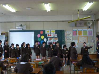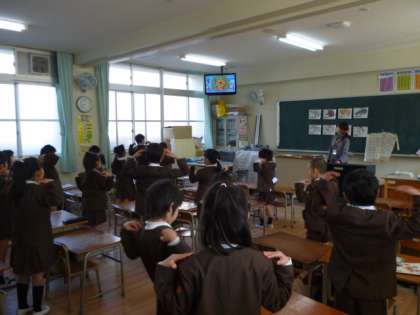 今日の1年生は、「Head, Shoulders, Knees and Toes」の歌を聞いて、音楽に合わせて一緒に体を動かします。3年生は、「What fruit do you like? I like ~.」と英語で質問し、英語で答えようでした。