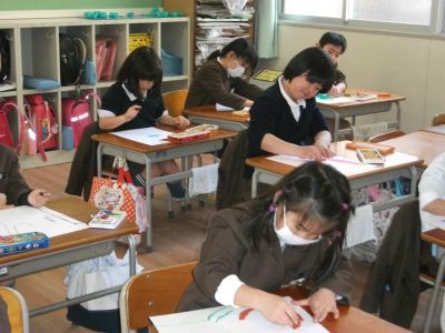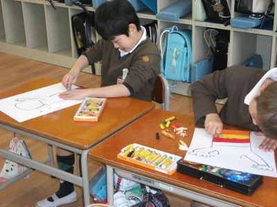 新1年生が、元気に登校してくれるように、かわいい掲示物を作っています。