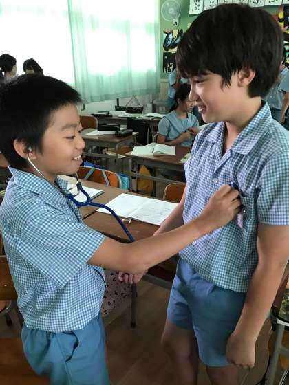 聴診器を使って心臓の音を聞きあいました。