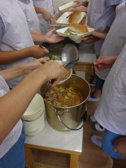 5年生の教室では、それぞれの当番が手際よく配膳をすすめます。「いただきます。」をしたら、おかずやパンを自分の食べやすい量にふやしたり減らしたりして、楽しく食べていました。