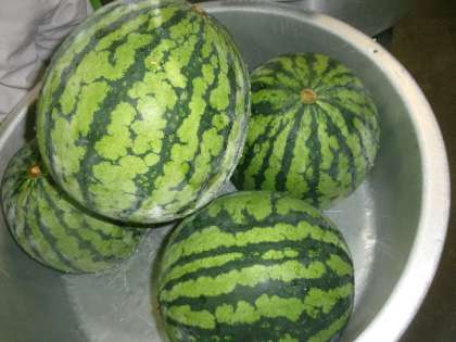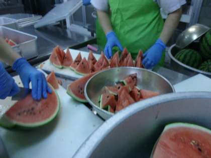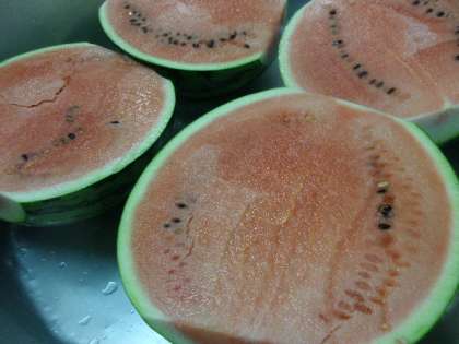 今日の献立は「コッペパン、りんごジャム、押し麦のスープ、夏野菜とベーコンのソテー、すいか、牛乳」でした。鳥取産の大きなすいかが19個届きました。きれいに洗って、1個を64切れに切って、大きなバットに並べて教室に届けました。