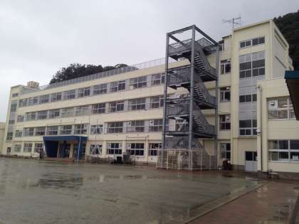 学校が開いていない時間帯・曜日でも避難できるように、校舎の外に階段がつけてあります。