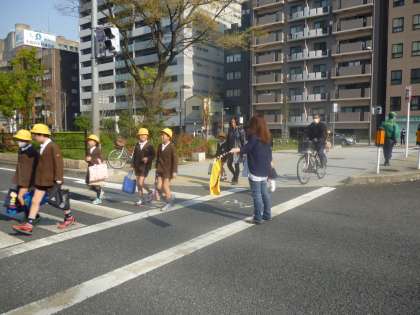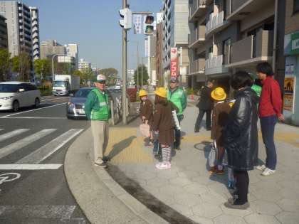 新学期の始業式の朝、西六・堀江連合の地域の見守り隊の皆さんと、PTAの方々により児童の安全の見守り活動をしていただきました。子どもたちも元気な声で「おはようございます。ありがとうございます。」とあいさつしています。
