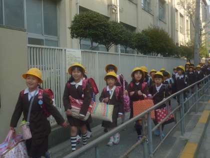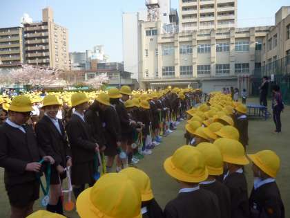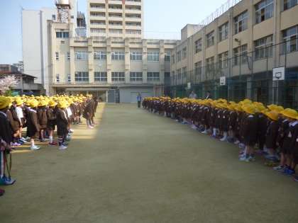 朝の児童朝礼で、1年生と在校生との対面式があり、6年生から記念のメダルをプレゼントされました。