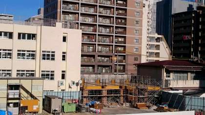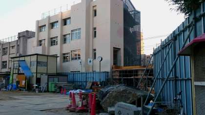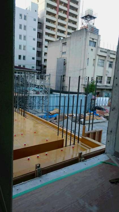 旧校舎の2階の廊下のつきあたりは解放されていますが、新校舎の方も2階まで骨格が出来てきたので、もう少しで廊下が繋がります。