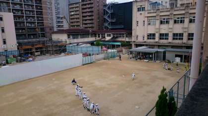 小学校では、工事で狭くなった運動場ですが子どもたちが練習しています。