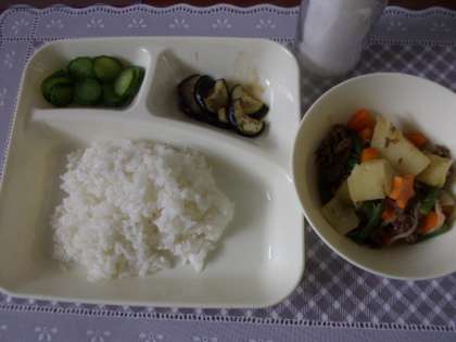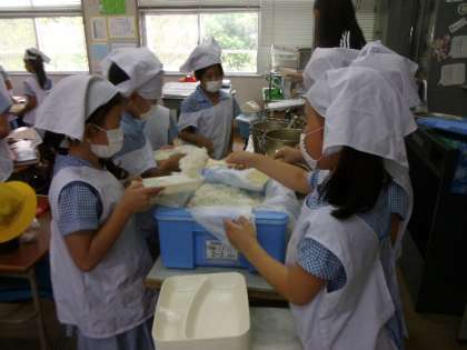 2年生の教室では、どうもなすの苦手な人が多くて、配膳の時から「なすは後でへらそう。」というつぶやきが聞こえています。先生が「なすをへらす人はきてください。」というと、長い行列ができました。でも、大好きな人もいて、結局は空っぽになっていました。