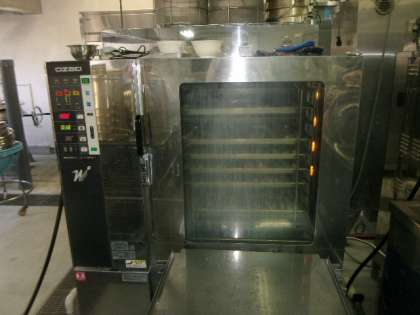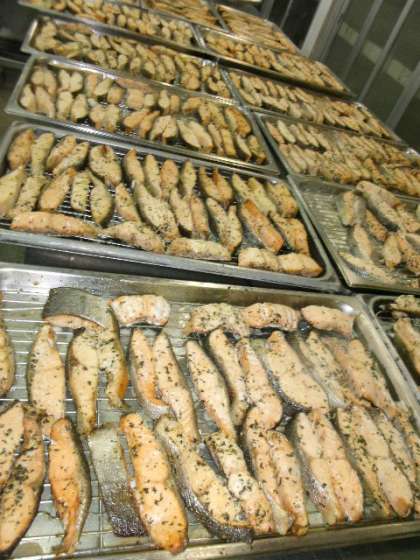 今日の献立は「ごはん、さけのバジル焼き、大豆とごろごろ野菜のトマト煮、三度豆ともやしのサラダ、牛乳」でした。さけは、にんにく、料理用ワイン、塩、こしょう、バジル、オリーブ油で下味をつけて焼き物機で焼きました。1人50gで1切れのさけが、一度に500人分焼けます。焼き上がって焼き物機の扉を開けると、バジルの香りが広がりました。