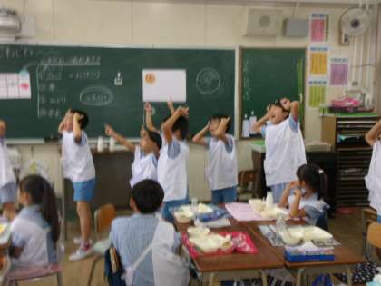 2年生の教室では、「いただきます。」をすると、みんなパクパクと食べ始めました。おかわりもたくさんして、残っている牛乳はモーモーじゃんけんで全部飲むことができました。パンもおかずも牛乳も、全部空っぽになりました。